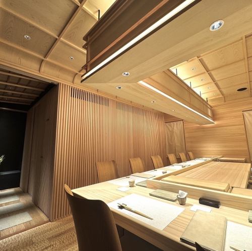 足を踏み入れると、まず感じるのは木の香りとやわらかな光。カウンターには、樹齢500年を超える吉野檜が静かに佇み、控えめな美しさを放ちます。無駄をそぎ落とした設えが、ひとときの食事を特別な時間へと変えてくれる空間です。記念日・誕生日や接待など、多彩なシーンでご利用ください。